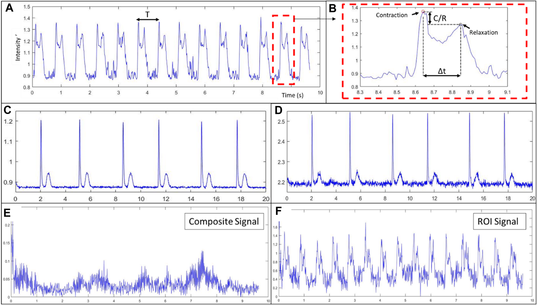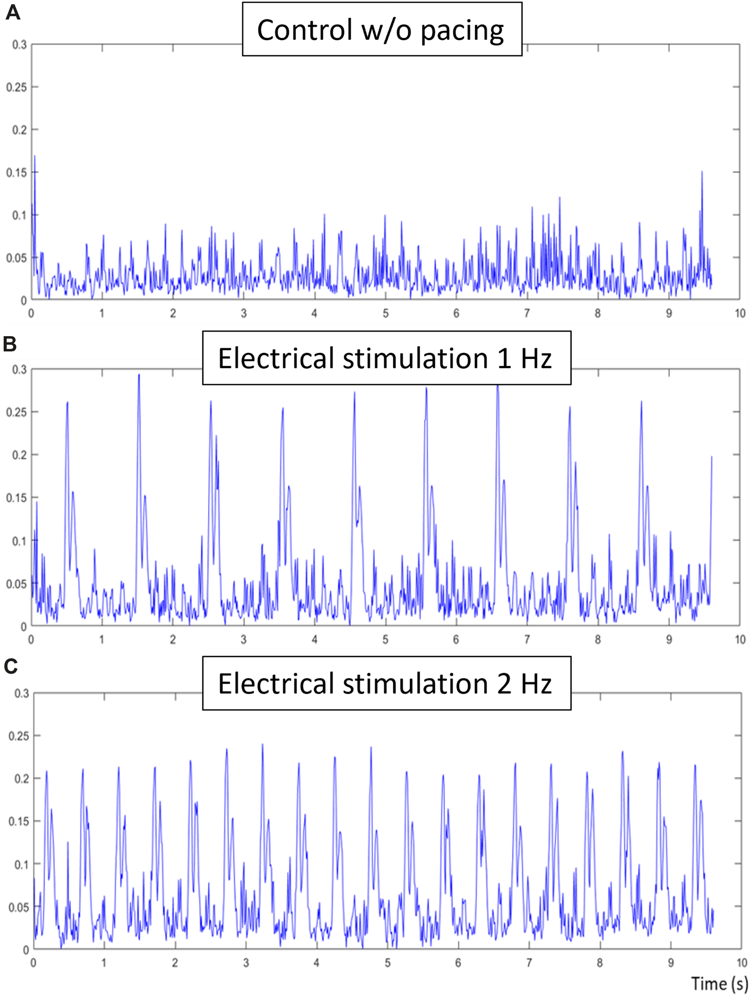 Electrical stimulation validation, (A) is the control composite signal obtained without electrical stimulation of the tissue, (B) is the composite signal obtained during 1hz electrical stimulation of the tissue and (C) is the composite signal obtained during 2 hz electrical stimulation. The same sample has been used for all three acquisitions, each of 10 s at 100 fps. While no contractions were detected in the control signal, clear contraction-relaxation pairs can be observed in the electrically-stimulated signals. Respective contractile characteristics of these signals are the following: period of contraction of 1.01 and 0.508, time between peak-pairs of 0.079 s and 0.077, and relative ratio of peak-pairs of 0.91 and 0.95.