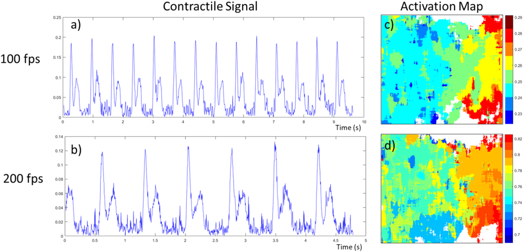 In addition to validating the prototype’s capacity to generate these activation maps, we explored the effect of the acquisition speed on both the contractile signals and activation maps. For this, we used the same tissue preparation of NRCM, and took two acquisitions of 975 frames, one at 100 fps the other at 200 fps. The resulting signal and activation maps for their first contraction are presented in Figure 8. The contractile characteristics computed from the videos are as follow, respectively: a beating frequency of 1.47 Hz and 1.39 Hz, a time between peaks of 192 ms and 186 ms, and a relaxation to contraction ratio of 0.521 and 0.563. As these videos were taken in an environment where small variations in temperature are possible over time, this could explain why the frequency reduced for the second recording at 200 fps. As the beating rate is the same, using a higher sampling speed allows the contractile signal, more specifically the contraction peaks pair, to have twice as many data points, meaning a better time resolution. As an example, in Figure 8B, we can observe a slight tilt of the relaxation peak towards the right whereas in Figure 8A it is uncertain if it is not just due to noise. Additionally, this better time resolution permits the activation maps to have more time increments, as shown in Figures 8C, D.