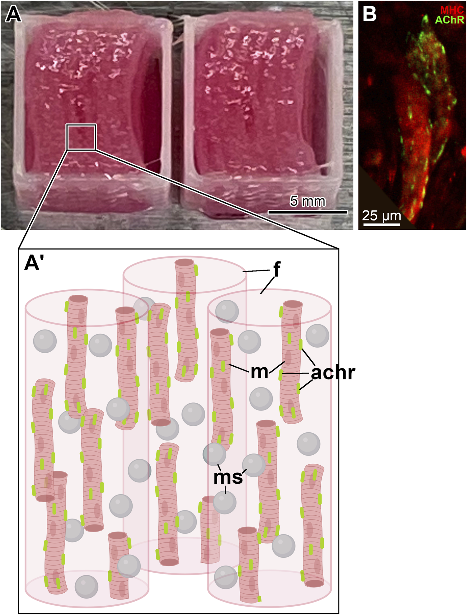 For in vivo implantation, the fully printed skeletal muscle constructs (Figures 1A, A’) were composed of eight stacked layers of cell-laden bioink with sacrificial bioink spacers and had dimensions of