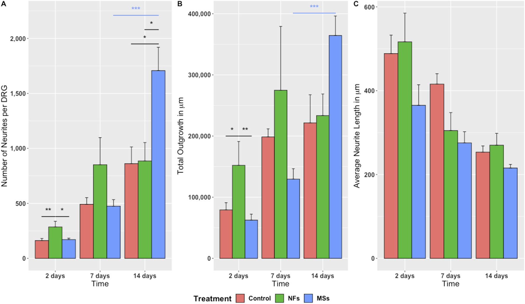 Figure 3. Quantitative assessment of neurite sprouting from the chick embryo DRGs grown on 3D bioprinted skeletal muscle constructs. Three metrics were used: (A) Number of neurites sprouting from individual ganglia; (B) Total outgrowth (the sum total of neurite length); (C) Average neurite length. The significance level annotations are shown in black for the treatment cohorts at each time point and in the respective color for each treatment cohort across time points. Three to eight ganglia were quantified per treatment cohort at each time point. The freely dissolved neurotrophic factors (NFs) induced higher neurite sprouting on day 2. This effect was, however, unsustainable. In contrast, the neurotrophic factors delivered in microspheres (MSs) induced the sprouting of more neurites per ganglion and higher total neurite outgrowth by day 14. *