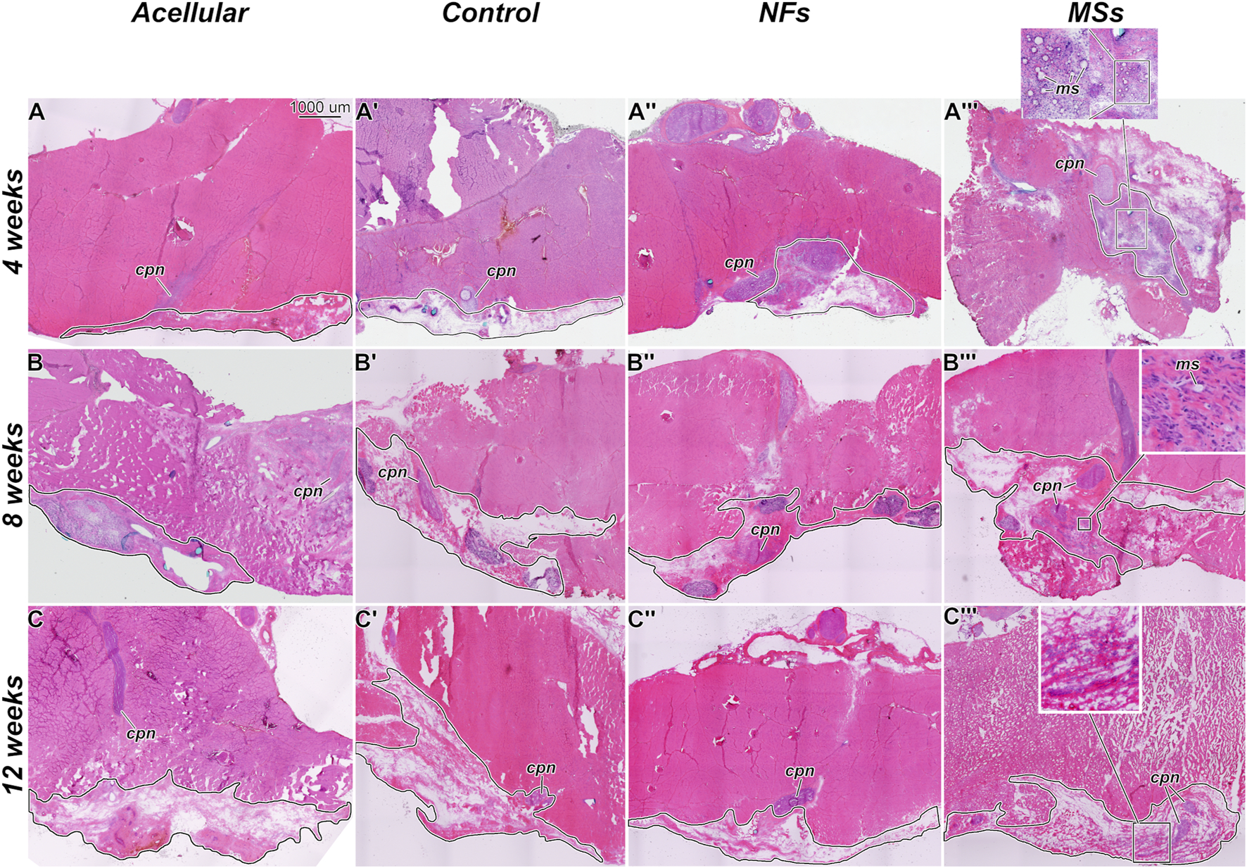Figure 4. Representative micrographs of the histological organization of the tissue samples from the in vivo transposed nerve study at 4 weeks (A–A‴), 8 weeks (B–B‴), and 12 weeks (C–C‴) post-implantation. Hematoxylin and eosin staining. The Acellular cohort involves fibrin hydrogel implants that contain no cells and no neurotrophic factors. The Control group involves biofabricated muscle implants with 30 million hMPCs per mL of hydrogel, but no extrinsic neurotrophic factors. The third group (NFs) contains CNTF and GDNF freely dissolved in the extracellular matrix of the implant. The fourth group (MSs) contains the matching load of the neurotrophic factors encapsulated in PLGA microspheres suspended throughout the hydrogel of the construct. The implanted constructs are outlined. Note that in the MSs cohort, the microspheres are abundant in the extracellular matrix of the implant at 4 weeks post-implantation. After 8 weeks, they become much smaller in size and are no longer detectable after 12 weeks. This indicates that the microspheres slowly dissolve in time and release the encapsulated CNTF and GDNF. cpn–transposed common peroneal nerve; ms–CNTF/GDNF-loaded PLGA microspheres.