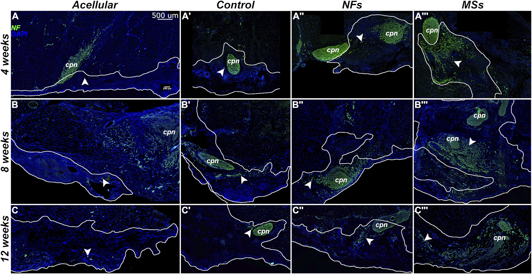 Figure 5. Representative micrographs of the immunostained samples from the transposed nerve study at 4 weeks (A–A‴), 8 weeks (B–B‴), and 12 weeks (C–C‴) post-implantation. Sections were immunostained with an anti-neurofilament (NF) antibody (green) to visualize the sprouting neurites (arrowheads). The implanted constructs are outlined. The nuclei are stained with DAPI (blue). cpn–transposed common peroneal nerve.