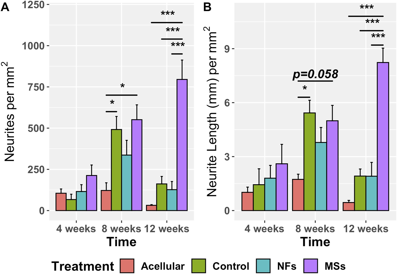 Furthermore, the neurite sprouting showed different temporal patterns among the treatment cohorts (Figure 6). In the Acellular cohort, there was no significant variation over time. In the Control and NFs cohorts, there was a trend of increasing sprouting between 4 weeks and 8 weeks followed by a decrease at 12 weeks, probably due to neurite pruning, as it commonly happens in neuronal circuitry development (Schuldiner and Yaron, 2015). In contrast, only the MSs cohort showed sustainably high levels of neurite sprouting for up to 12 weeks post-implantation.