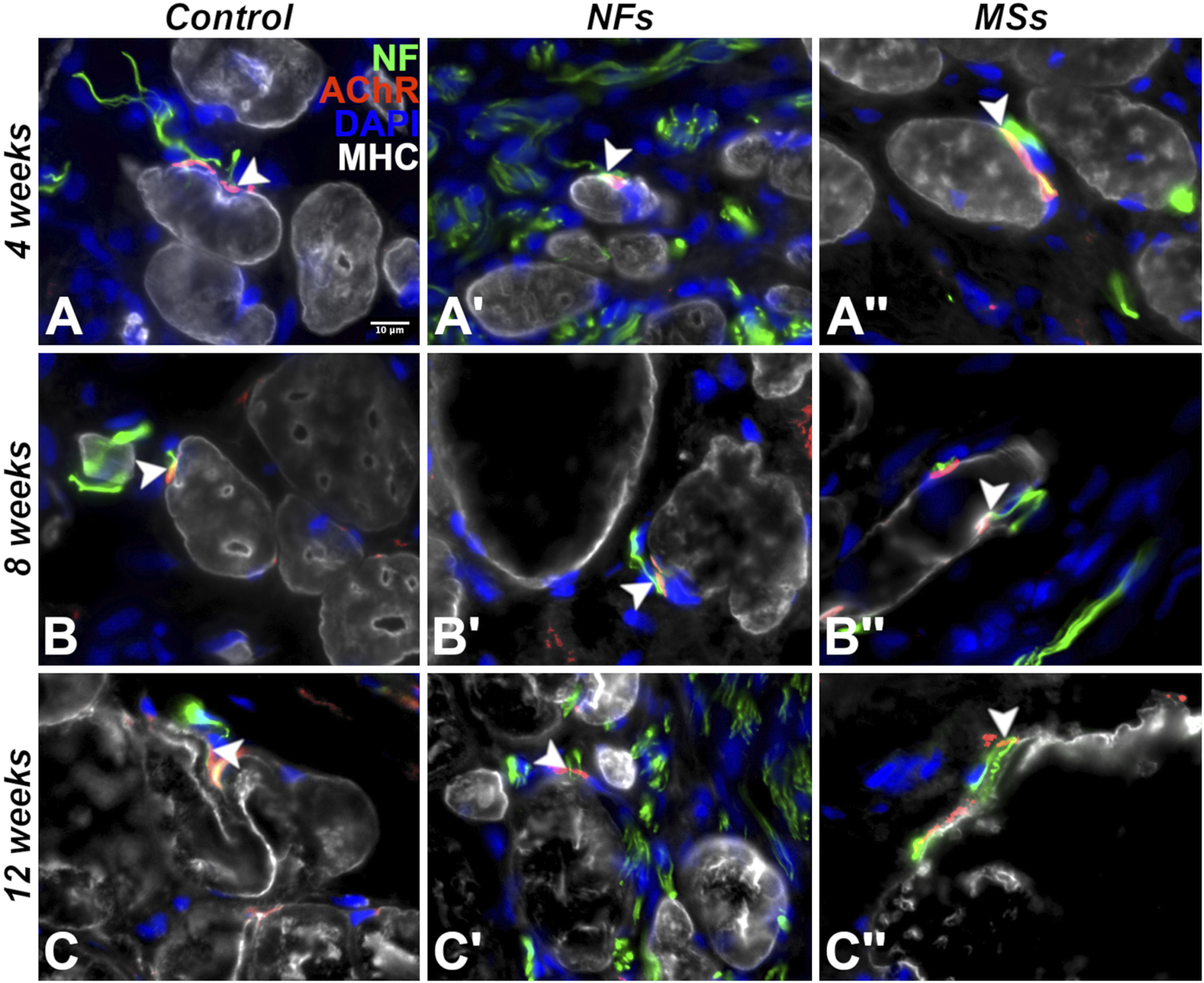 Figure 7. Representative micrographs of differentiation and innervation of skeletal muscle cells in the implants in the in vivo transposed nerve study at 4 weeks (A–A′′), 8 weeks (B–B′′), and 12 weeks (C–C′′) post-implantation. Triple immunostaining with an AChR antibody (red), an anti-neurofilament (NF) antibody (green), and anti-myosin heavy chain (MHC) antibody (white). The nuclei were stained with DAPI (blue). White arrowheads indicate neuromuscular junctions. As early as 4 weeks post-implantation, the cells in the implant display the proper skeletal muscle cell phenotype and form neuromuscular junctions with the sprouting neurites of the host. The muscle cells in the implant maintained their phenotype and stayed innervated throughout the duration of the experiment (12 weeks post-implantation).