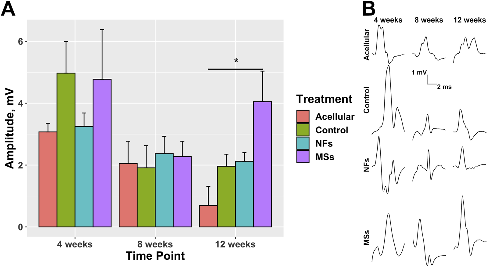 Figure 8. Compound muscle action potential (CMAP) in the transposed nerve model study at 4, 8, and 12 weeks post-implantation. The Acellular cohort received bioprinted implants containing only fibrin hydrogel with no cells and no intrinsic neurotrophic factors. The Control group contains cellularized biofabricated muscle implants without any extrinsic neurotrophic factors. The third group (NFs) contains CNTF and GDNF freely dissolved in the extracellular matrix of the cellularized implant. The fourth group (MSs) contains the matching load of the neurotrophic factors encapsulated in PLGA microspheres suspended throughout the extracellular matrix of the construct. (A) CMAP amplitude. At 12 weeks post-implantation, the CMAP recorded from the constructs of the MSs cohort shows a trend to be higher than in the other two cohorts with cellularized constructs (the Control and NFs cohorts), and was the only one showing a statistically significant difference from the Acellular cohort. These data indicate that the CNTF and GDNF released from the PLGA microspheres facilitate innervation of the skeletal muscle implants after 12 weeks. This effect requires the microsphere-based neurotrophic factor delivery system and cannot be achieved by implementing the neurotrophic factors in the freely dissolved form. Three animals were analyzed in each treatment cohort (n = 3) *