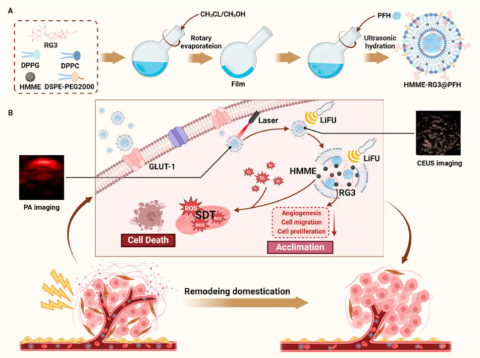 In this work, the targeted lipid nanoprobe HMME-RG3@PFH was constructed. The membrane adjuvant modification strategy of replacing cholesterol with RG3 was adopted to improve the nanoprobe’s circulation time and reduce macrophage immunosurveillance, while the encapsulated HMME and PFH enabled photoacoustic/ultrasound dual-modal imaging. The active targeting properties of RG3 combined with passive targeting by the enhanced permeability and retention (EPR) effect enhanced the efficient homing of the nanoprobes to MFs, thereby improving the early diagnosis of diseases of this class. Therapeutically, due to the dual targeting effect of HMME-RG3@PFH, the nanomaterial efficiently accumulated locally in the lesion. When used in combination with low-intensity focused ultrasound (LIFU) for dual-modal imaging, HMME-RG3@PFH achieved precise drug release and SDT, while RG3 regulated MFs and remodeled the target microvessels to produce synergistic therapeutic effects. Overall, HMME-RG3@PFH is an ideal drug delivery material for the future clinical treatment of MF-related diseases.