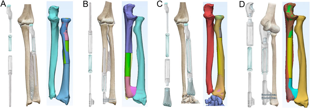 Figure 1. Designs of 3D-printed GFRS endoprostheses. (A) The proximal radial endoprosthesis consists of a proximal component with a smooth pole, a bushing, and a distal component with an intramedullary stem. Once assembled, the three parts form a telescoping structure that allows for rotation. The proximal component includes suture holes for annular ligament reconstruction. (B) The distal ulnar endoprosthesis features a proximal component with an intramedullary stem, a bushing, and a distal component with a smooth pole. The distal component has screw trajectories for fixation of the distal radioulnar joint. (C) The total radial endoprosthesis is designed with four components, similar to the telescoping structure of the other endoprostheses. The distal component is engineered for wrist arthrodesis, with predefined screw trajectories. (D) The total ulnar endoprosthesis also features four components with a similar telescoping structure. The proximal component is designed to enable hemiarthroplasty, as previously described.