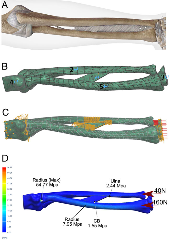 Figure 2. Development of a static FEA model of a normal forearm. (A) Depiction of the skeletal and ligamentous structures of the forearm. (B) DICOM data from a normal adult male, including the distal humerus (4), radius (5), ulna (2), and proximal carpal bones (3), were extracted, followed by volumetric reconstruction and surface smoothing. The interosseous membrane was modeled using the central band (CB, 1). A mesh was generated with a tetrahedron size of 2 mm. (C) The relationships between the elbow joint, humeroradial joint, wrist, and CB attachments were defined as direct contact and static bonding. (D) A compressive force of 200 N was applied to the distal radius and ulna, with a 4:1 distribution. Stress distribution was then calculated using the FEA method, with peak stresses shown for the ulna, radius, and CB.