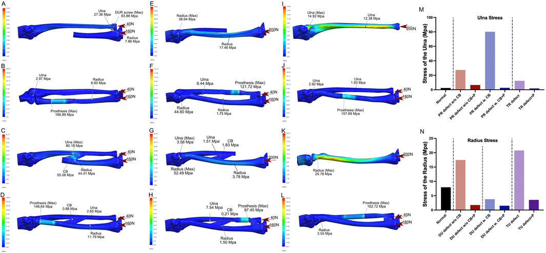 Figure 3. Illustrations of FEA results of various bone defects and their corresponding prosthetic reconstructions (A,B) A model of a proximal radial defect without the central band (CB) was simulated. In the case of reconstruction using distal ulnoradial fixation, high stress was observed at the distal ulna, distal radius, and screws when a 200 N compressive force, distributed 4:1 between the radius and ulna, was applied (A). Reconstruction using a proximal radial endoprosthesis reduced the stress on the ulna and radius to levels similar to normal, though the prosthesis experienced relatively high stress at the junction of the telescoping structure (B). (C,D) A proximal radial defect with the CB intact was modeled. Without reconstruction, high stress was concentrated at the CB and its attachment points on the ulna and radius under the same 200 N compressive force (C). Reconstruction with a proximal radial endoprosthesis reduced the high stress around the CB to near-normal levels, but stress remained relatively high in the prosthesis at the junction of the telescoping structure (D). (E,F) For a distal ulnar defect without the CB, leaving it unreconstructed resulted in increased stress in the proximal and diaphyseal regions of the radius under a 200 N load. Reconstruction using a distal ulnar endoprosthesis reduced the stress on the radius to near-normal levels, though the prosthesis bore relatively high stress at the junction of the telescoping structure. (G,H) In the case of a distal ulnar defect with the CB intact, the proximal radius experienced significant elevated stress under the same compressive force, while the diaphyseal radius experienced slightly decreased stress. When reconstructed with a distal ulnar endoprosthesis, the stress in both the ulna and radius decreased to even lower levels than normal, though relatively high stress persisted in the prosthesis at the junction of the telescoping structure. (I,J) A total radial defect was simulated, and without reconstruction, increased stress was seen in the ulna under the 200 N load. Reconstruction with a total radial endoprosthesis significantly reduced the stress on the ulna, but relatively high stress was observed in the prosthesis at the junction of the telescoping structure. (K,L) For a total ulnar defect, leaving it unreconstructed led to increased stress in the proximal radius under the 200 N compressive force. Reconstruction with a total ulnar endoprosthesis dramatically decreased the stress on the radius, although relatively high stress was still present in the prosthesis at the junction of the telescoping structure. (M,N) Bar charts illustrate the stress changes in the ulna (M) and radius (N) under various conditions, highlighting the impact of different reconstructions. (PR-proximal radius, w/o-without, CB-central band, w.-with, P-prosthesis, TR-total radius, DU-distal ulna, TU-total ulna).