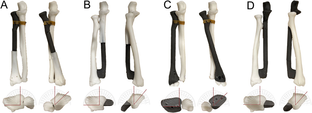 Figure 4. Ex vivo testing of the rotational function of GFRS prostheses. (A) A resin model simulating a proximal radial defect with reconstruction using a proximal radial endoprosthesis was created. The annular ligament reconstruction was mimicked by securing the prosthesis to the proximal ulna with a rubber band. The model demonstrated a maximum of 90° supination and 45° pronation without significant tension. (B) A resin model simulating a distal ulnar defect with reconstruction using a distal ulnar endoprosthesis was created. The model achieved a maximum of 90° supination and 40° pronation without noticeable tension. (C) A resin model simulating a total radial defect with reconstruction using a total radial endoprosthesis was created. The annular ligament reconstruction was simulated similarly by attaching the prosthesis to the proximal ulna with a rubber band. The model demonstrated a maximum of 90° supination and 45° pronation without significant tension. (D) A resin model simulating a total ulnar defect with reconstruction using a total ulnar endoprosthesis was created. The model demonstrated a maximum of 90° supination and 40° pronation without noticeable tension.