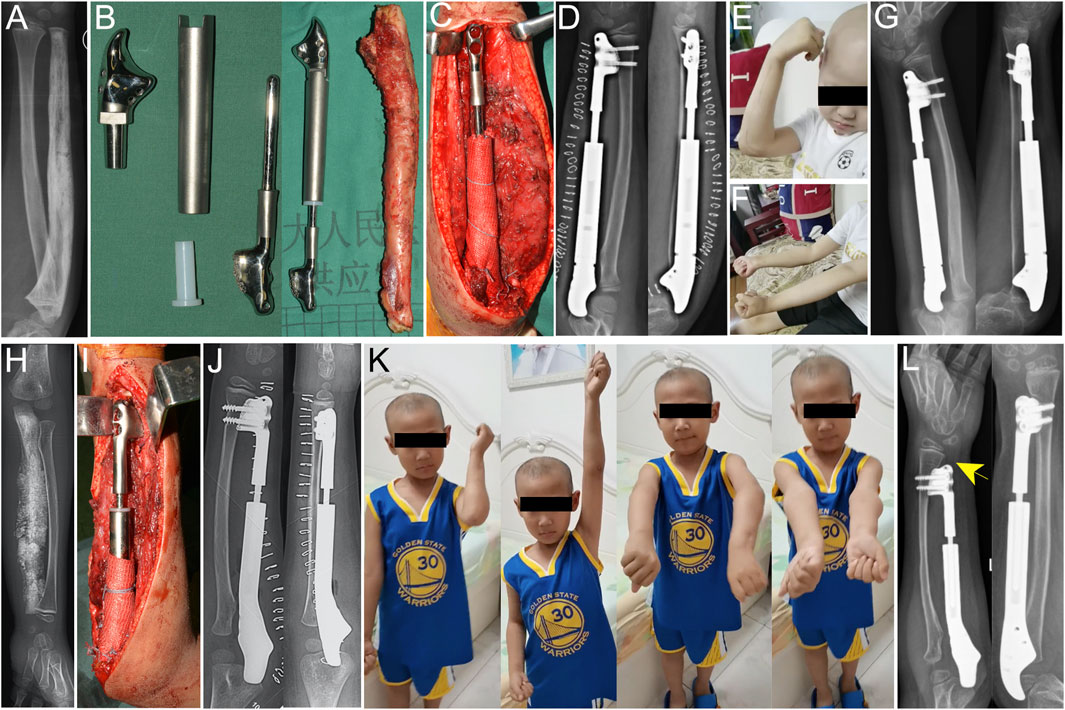 Figure 5. Application of the total ulnar endoprosthesis in Case 1 (A–G) and Case 2 (H–L). (A) Post-neoadjuvant chemotherapy X-ray of a 7-year-old boy with Ewing sarcoma of the right ulna. (B) The endoprosthesis consisted of four parts that could be assembled to form a telescoping structure. (C) Intraoperative photo after the installation of the endoprosthesis. A LARS ligament was used to repair the capsule and the triceps insertion. (D) A postoperative X-ray showed the endoprosthesis in a good position. (E) The patient achieved a range of motion (ROM) of 30°–120°. (G) A follow-up X-ray after 42 months revealed a slight ulnar inclination of the wrist. (H) X-ray image of a patient with osteosarcoma in the left ulna following neoadjuvant chemotherapy. (I) An intraoperative photo after implantation of the endoprosthesis. (J) Postoperative X-ray showing the positioning of the implant. (K) The patient regained nearly full function of the upper limb. (L) A follow-up after 35 months indicated a discrepancy between the ulna and radius (yellow arrow).