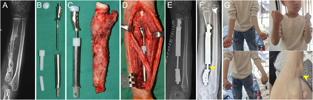 Figure 6. Application of the proximal radial endoprosthesis in Case 3. (A) X-ray image of a patient with osteosarcoma in the proximal radius following neoadjuvant chemotherapy. The estimated residual radius after tumor resection was too short to accommodate a regular stem. (B) The components of the proximal radial endoprosthesis. The endoprosthesis adopted a 3D-printed short stem with an interlocking screw to achieve fixation. (C) The endoprosthesis alongside the excised specimen. (D) Intraoperative photo taken after the installation of the endoprosthesis. The telescoping structure was used to adjust the length of the endoprosthesis. (E) Postoperative X-ray demonstrating the positioning of the implant. (F) A follow-up after 32 months revealed radial inclination of the wrist (white arrow). A proximal migration of the prosthesis was observed (yellow arrow). (G) The patient regained nearly full function of the upper limb. Protrusion of the distal ulna was seen due to the proximal migration of the prosthesis (yellow arrow).