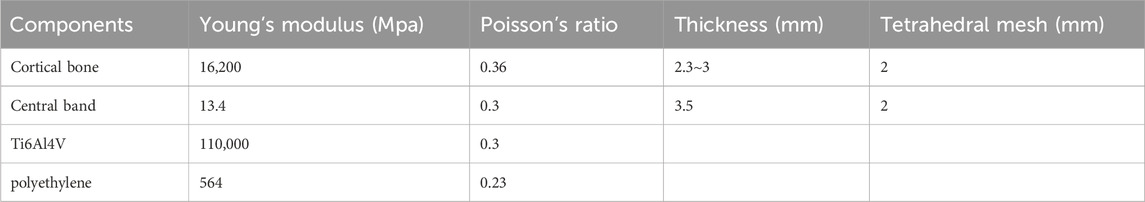 For endoprosthetic reconstruction models, the relationships between the intramedullary stem and residual bone, as well as the components fixed to adjacent bones by screws, were defined as tied contact, while the telescoping structure was defined as mobile.