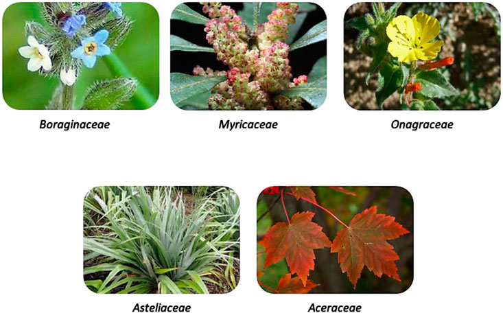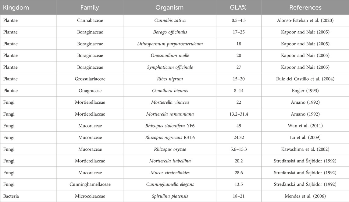 Research indicates that GLA is present in various plant families, including Boraginaceae, Myricaceae, Onagraceae, Asteliaceae, and Aceraceae (Table 1; Figure 2). GLA is a molecule synthesised by multiple plants, fungi, yeasts, and algae. However, its chemical synthesis is challenging due to the possibility of isomerisation of its double bonds into cis or trans configurations, with only the cis form naturally occurring. Trans isomers of fatty acids can be less biologically active or even harmful compared to their cis counterparts. GLA is naturally found in the oils of several plant seeds, including borage (Borago officinalis), evening primrose (Oenothera biennis), and black currant (Ribes nigrum). Borage oil contains the highest GLA content, ranging from 20%–27%. Although seeds contain more oil than other parts of the plant, different tissues are also recognised as a source of GLA. The Boraginaceae family is particularly noted for its high GLA content due to the presence of specific enzymes that enhance GLA production. Due to the expense and inefficiency of extracting and purifying GLA from natural sources, there is growing interest in using biotechnological methods for GLA production (Pérez-García and Wendisch, 2018). Biotechnological approaches, such as the metabolic engineering of microbes and various fermentation processes, are being explored to offer higher yields, lower costs, and more sustainable alternatives to plant-based extraction.