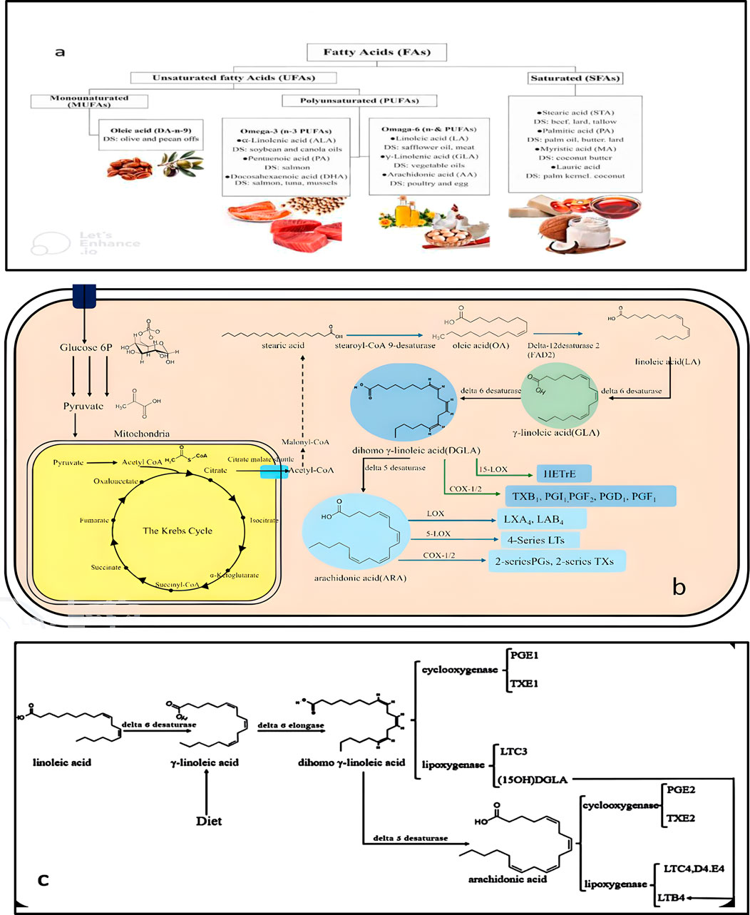 Figure 3. Classification of fatty acids, sources, biosynthesis, and GLA. (a) Saturated (SFAs) and unsaturated (UFAs) are the two categories of fatty acids. Among the unsaturated fatty acids, there are monounsaturated fatty acids (MUFAs) and polyunsaturated fatty acids (PUFAs). Gamma-linolenic acid (GLA) is a polyunsaturated fatty acid (PUFA). DS: Dietary sources. (b) Fatty acid biosynthetic pathway: The biosynthesis of fatty acids in eukaryotic cells generally follows a common scheme initiated with acetyl-CoA and malonyl-CoA, culminating in the formation of fatty acids such as palmitic and stearic acids. Oleic acid (OA), an omega-3 and omega-6 pathway precursor, is formed, and the reaction is initiated when glucose is transported into the cell through specific glucose transporter proteins. The glucose is phosphorylated to glucose-6-phosphate, which is catabolised via glycolysis to yield pyruvate. Pyruvate is fed into the mitochondria and reduced to acetyl-CoA by the complex of pyruvate dehydrogenase. Acetyl-CoA passes into the Krebs cycle and is converted into intermediates like citrate, succinyl-CoA, and malate, before getting converted back to Acetyl-CoA in the cytoplasm. This Acetyl-CoA is carboxylated into malonyl-CoA, which is extended into chains to form stearoyl-CoA, and desaturated into OA. OA is then desaturated to linoleic acid (LA), which is further desaturated to GLA, DGLA, and finally ARA. ARA is metabolised to leukotrienes (LTs), lipoxins (LXs), and cyclooxygenase products such as 2-series prostaglandins (PGs) and thromboxanes (TXs). DGLA is also metabolised via various pathways to yield hydroxy eicosatrienoic acids (HETEs) and other eicosanoids such as TXB1, PGI1, PGF2, PGD1, and PGF1. (c) GLA is converted to DGLA in the liver, and DGLA can be metabolised in three ways: it can be reduced to prostaglandin PGE1 by COX, to 15-hydroxy eicosatrienoic acid (15-HETrE) by lipoxygenase, or to ARA by D5D. The anti-inflammatory activity of DGLA is obtained in three ways: it replaces ARA in inflammatory cells’ membrane, blocks the metabolism of ARA by COX and lipoxygenase by competing with the latter, and forms anti-inflammatory PGE1 that dilates pulmonary vessels. DGLA also forms 15-HETrE and blocks the formation of LTB4 by ARA and is anti-inflammatory.
