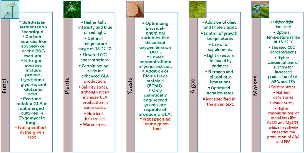 Figure 4. Positive (green) and Negative (red) effects of each organism. This figure summarises the key biological sources and influencing factors on γlinolenic acid (GLA) production. GLA is synthesised by certain Zygomycete fungi such as Mucor spp. and Thamnidium elegans, particularly in submerged culture systems, while edible and medicinal mushrooms do not produce GLA. In plants, environmental factors like light, temperature, CO2 concentration, and specific amino acids (e.g., glutamine, histidine, cysteine) enhance GLA biosynthesis, whereas salinity, water limitation, and nutrient stress may suppress it. GLA production in algae is species-dependent and influenced by factors such as light intensity, nutrient availability, and medium supplementation. Mosses show limited data on GLA biosynthesis, and exposure to stress or heavy metals tends to reduce their polyunsaturated fatty acid levels. Lastly, yeasts require genetic engineering to produce GLA, as wild-type strains lack the biosynthetic pathway. Culture conditions like pH, carbon-to-nitrogen ratio, and aeration predominantly affect lipid accumulation in yeasts.