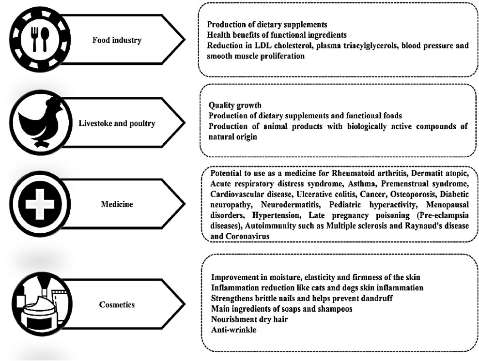 Beyond its fundamental nutritional value, GLA also possesses bioactive properties. The body can convert GLA into bioactive compounds such as DGLA, which exhibit both anti-inflammatory and potential anticancer effects in vitro (Van Hoorn et al., 2008). This conversion has led to studies exploring GLA supplementation as an alternative to nonsteroidal anti-inflammatory drugs (NSAIDs) for treating conditions like rheumatoid arthritis (Van Hoorn et al., 2008). Additionally, GLA has demonstrated potential benefits in areas such as cardiovascular health, diabetic neuropathy management, treatment of atopic dermatitis, and alleviation of cyclical mastalgia (Belch et al., 1988). Furthermore, GLA is being investigated as a potential therapeutic agent in the treatment of various cancers, including prostate, colorectal and pancreatic cancers (Kairemo et al., 1998; Kalampounias et al., 2024a; Kalampounias et al., 2024b). While most of the evidence remains confined to in vitro studies, these studies have shown promising results, although further clinical trials and epidemiological research are still required. Recent research also highlights that deficiencies in fatty acids, such as GLA, DGLA, ARA, EPA, and ALA may increase susceptibility to diseases like COVID-19. Milder cases of the virus have been observed in children and premenopausal women, who tend to have higher levels of beneficial fatty acids such as GLA and DGLA, which possibly help combat the virus (Das, 2021). This emphasises the unique role of GLA in the immune system, distinguishing it from other fatty acids and showcasing its potential impact on disease prevention.