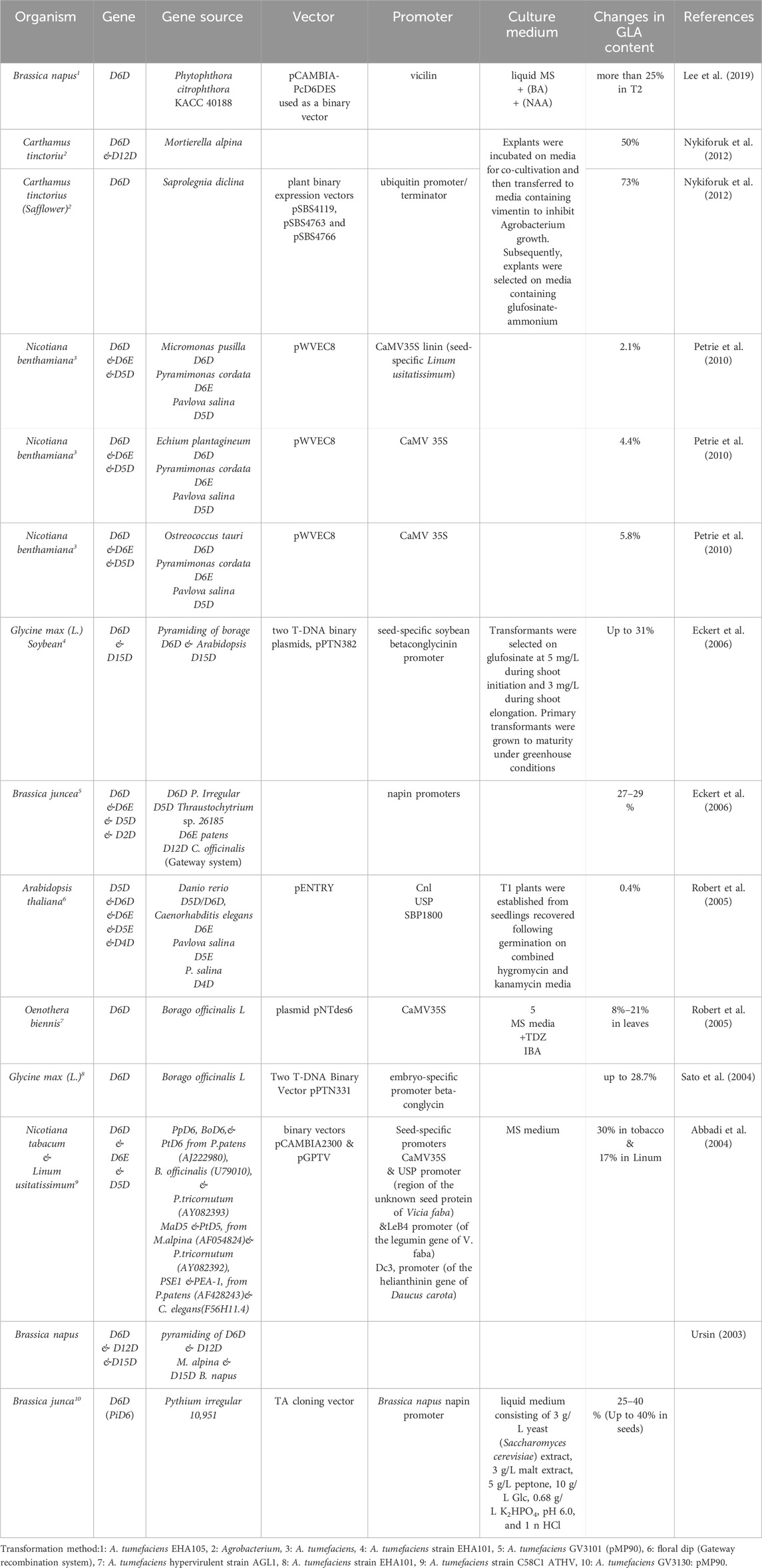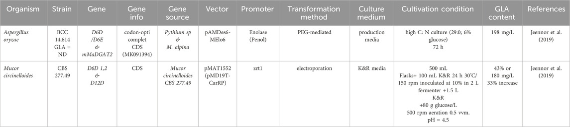 These findings are illustrated in Table 3, which depicts the genetic engineering of fungi to increase the amount of GLA (Tamano et al., 2023).