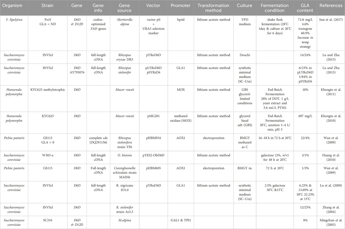 The ease of genetic manipulation and the high efficiency of homologous recombination in yeasts make them ideal platforms for synthetic biology projects and industrial biotechnology applications (Table 4) (Schindler, 2020; Taghon and Strychalski, 2023; Gupta et al., 2024). The codon-optimised D6D from M. alpina was introduced into Yarrowia lipolytic, controlled by the solid hp4d promoter. The engineered strains produced a total fatty acid profile containing 4.6% GLA (Gu et al., 2023).