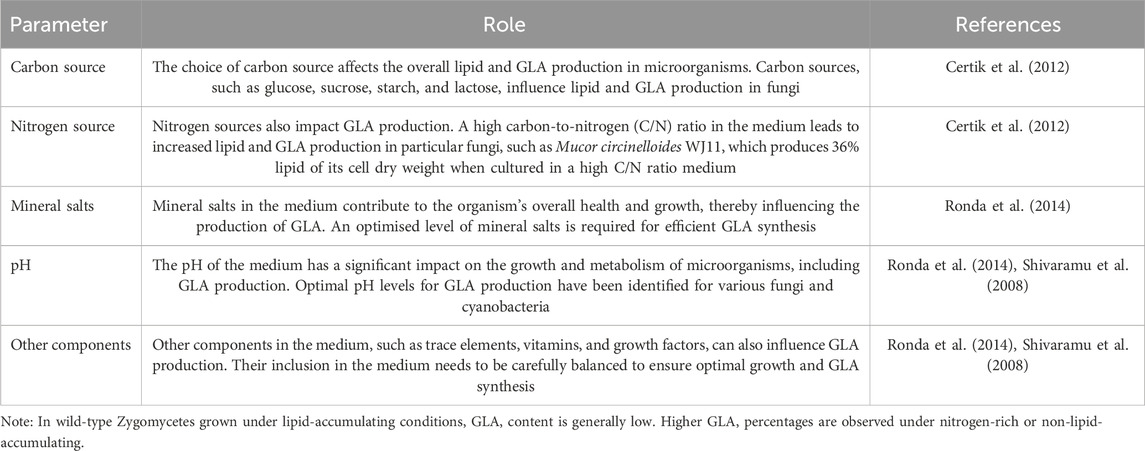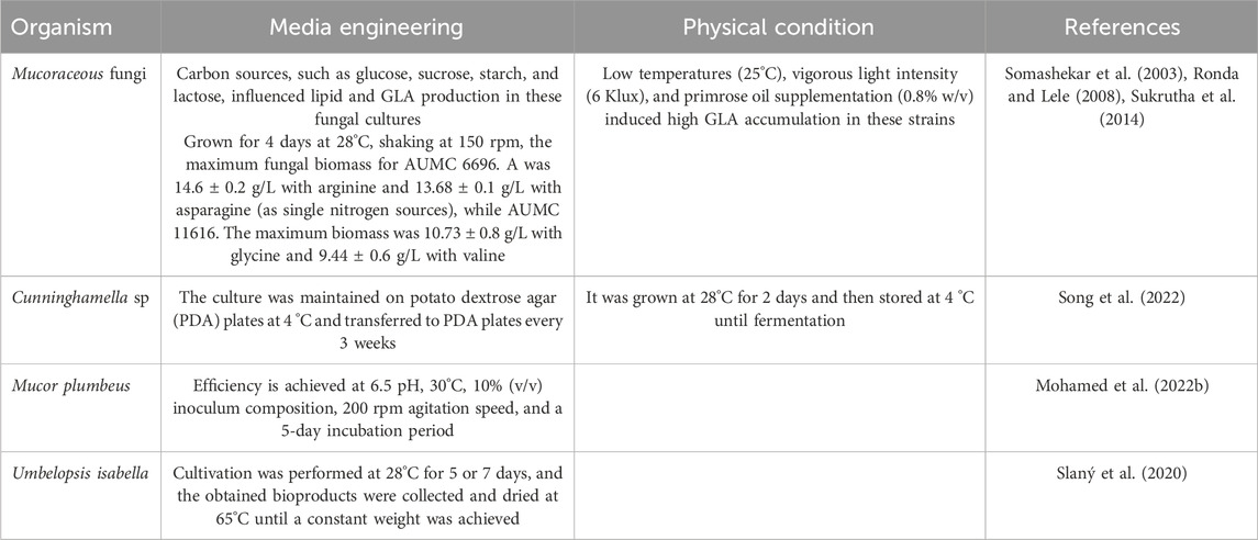 The culture conditions in engineering play a crucial role in enhancing the production of lipids and GLA in microorganisms. Studies on Mucor rouxii and Mucor sp.1b have provided valuable insights into the optimal culture conditions for high accumulation. These strains thrive at low temperatures, around 25°C, and with vigorous light intensity, specifically at 6 kLux. Additionally, adding a primrose oil supplement at a concentration of 0.8% w/v has further enhanced production in these strains. The choice of carbon and nitrogen sources significantly affects lipid and GLA production. Specific carbon sources, such as glucose, sucrose, starch, and lactose, have been identified as influential factors in the growth and metabolism of these microorganisms. Similarly, nitrogen sources like potassium nitrate have been found to impact lipid and GLA production by carefully selecting and optimising these nutrient sources. Scientists can create a favourable environment for the organism, increasing lipid and GLA production. Culture condition engineering is a multifaceted approach that involves manipulating specific cultural parameters to create a favourable environment for the organism to boost GLA production. This can include adjusting temperature, light intensity, and nutrient sources and employing other genetic and metabolic engineering techniques (Table 5) (Hansson and Dostálek, 1988; Certik et al., 2012).