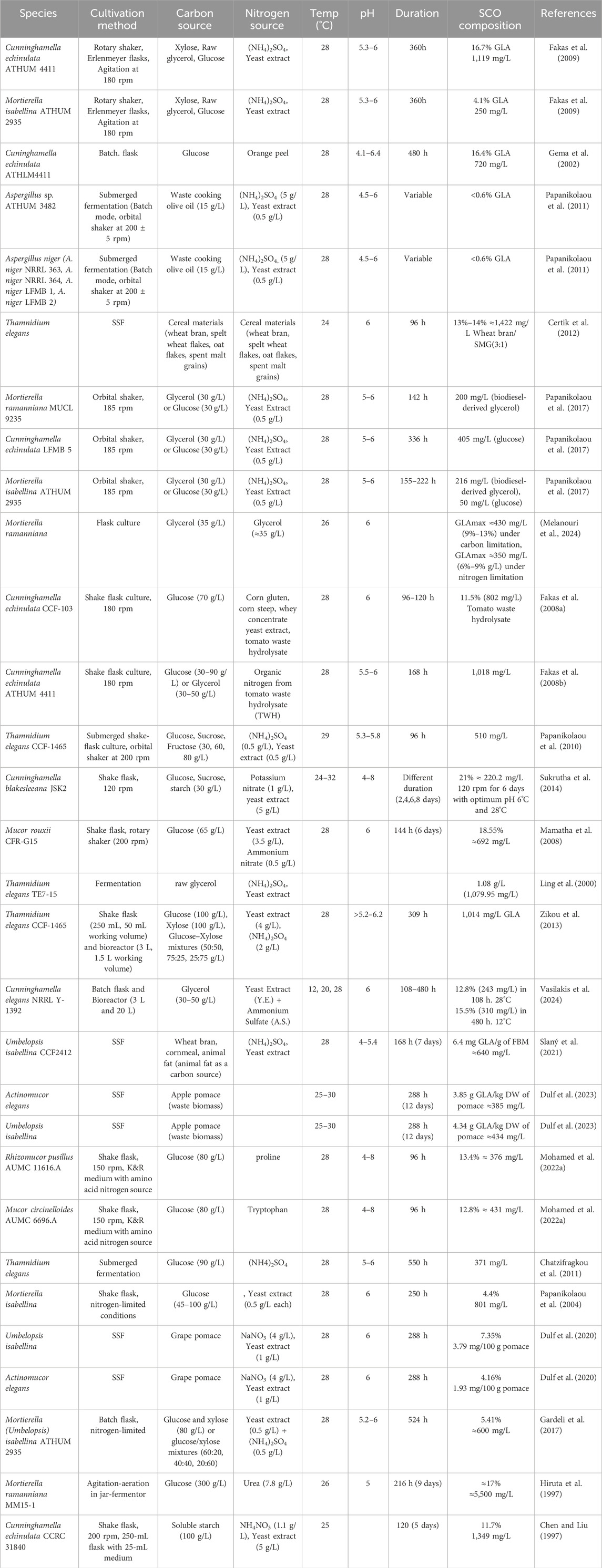 However, the production cost of single-cell oil (SCO) remains a challenge. To mitigate this, researchers have tried to use industrial and agro-industrial waste as low-cost carbon sources. For instance, tomato waste hydrolysate (TWH) and crude glycerol have been discovered to be promising substrates for oleaginous fungi to biosynthesise lipids during nitrogen starvation conditions. Experiments with C. echinulata revealed the effect of limiting nitrogen on lipid content and GLA production. Cultivation of C. echinulata in TWH-supplemented medium resulted in lipid content in biomass of approximately 39.6%, and GLA content was 802 mg/L with 96–120 h of incubation. The study also demonstrated that the use of various carbon sources, such as glucose (30–90 g/L) or glycerol (30–50 g/L), influenced lipid accumulation, highlighting the strain’s versatility in cultivation on diverse substrates for microbial lipid production. Other oleaginous microorganisms, such as Y. lipolytica and M. isabellina, can convert crude glycerol into microbial lipids. Y. lipolytica demonstrated an extremely high lipid content of 51.7% (w/w) in biomass, further confirming its potential for large-scale production of SCO (Fakas et al., 2008b; Fakas et al., 2008a). The accumulation of lipids by the strain has also been studied using various carbon sources, including glucose and glycerol. Hence, it proved to be flexible in terms of strain regarding the application of different substrates for the production of SCO. In a different experiment, T. elegans CCF-1465 was used to grow in submerged shake-flask culture utilising low-cost sugar refinery wastes, i.e., glucose, fructose, and sucrose, as carbon sources. The fungus exhibited high lipid production, with a notable accumulation during the initial phase of sugar consumption. Sugar uptake reduced progressively while lipid accumulation continued to occur. The maximum lipid yield was more than 9 g/L with an optimum 70% (w/w) lipid content in dry biomass, suggesting the suitability of the strain for large-scale lipid production. The lipids produced by the microbes were largely oleic and palmitic acids and seemed suitable as feedstock for biodiesel fuel. GLA was also produced at a level of approximately 510 mg/L, once more highlighting the potential for the utilisation of T. elegans in GLA production (Papanikolaou et al., 2010). Tables 6 and 7 contain additional information regarding the various conditions used in fungi in GLA production.