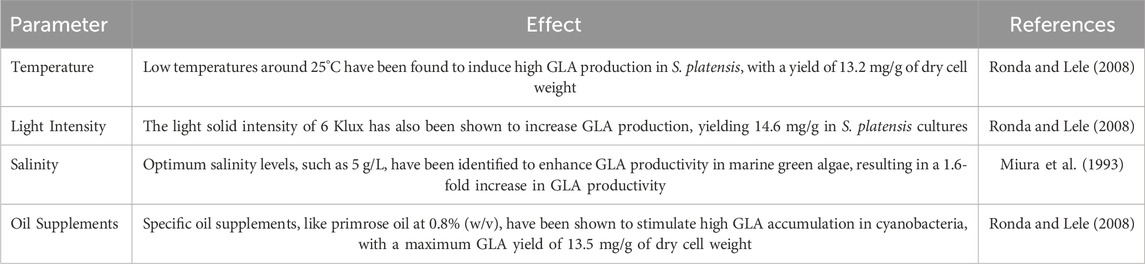The research investigated how Spirulina platensis produces GLA in different stressful conditions. The experiments demonstrated that adding oleic acid and LA at various growth temperatures, along with oil supplements, enhanced the production of fatty acids. Also, when the cultures were exposed to varying light levels, the ratio of GLA to total fatty acids remained constant. The best conditions for producing lipids and GLA in algae depend on various factors such as temperature, light intensity, salinity, and specific oil supplements. Studies suggest controlling these factors is crucial for enhancing GLA production in algae cultures (Wang et al., 2022; Jin et al., 2019). Specific parameters for GLA production in algae, including temperature, light intensity, salinity levels, and oil supplements, have also been identified. Optimising these parameters can improve GLA production in algae, making them suitable for industrial applications (Table 8).