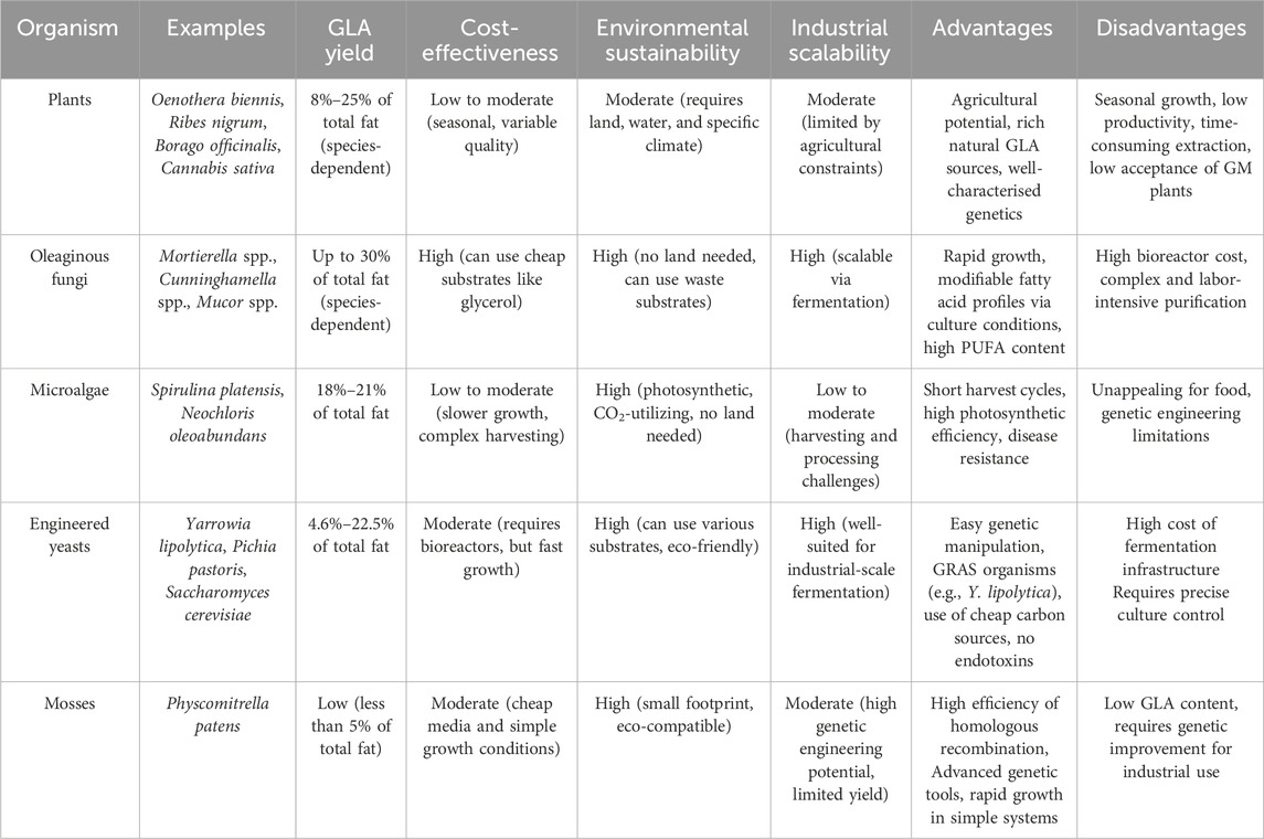 Plants offer advantages such as genetic manipulability, suitability for large-scale cultivation, and are generally regarded as safe (GRAS). However, plants may produce GLA at different levels than other organisms, making them less efficient for production. Currently, GLA sources are limited to a few plant species with weak agronomic properties. Therefore, developing a commercially viable and economical source could be desirable. One approach has been to transfer the D6D gene to convert LA to GLA in oilseed plants (Zhang et al., 2017). Table 2 summarises some plants used as hosts for GLA production (Wu K. et al., 2023). The advantages of plant-based GLA production include cost-effectiveness, compared with traditional chemical synthesis methods, being inherently a renewable resource with sustainable growth, with minimal environmental impact, and efficient in carbon sequestration. Additionally, plant-based GLA can offer nutritional benefits, including omega-3 fatty acids. However, there are challenges and drawbacks, such as limited sources, with only a few plant species currently able to produce significant amounts of GLA, agronomic limitations, as many plants with high GLA content have limited agronomic properties, making large-scale cultivation challenging, and the need for genetic modification, which is often required to enhance GLA production in plants, and can be costly and time-consuming. Recent advancements, such as CRISPR-Cas9 (Kan et al., 2022), have enabled more efficient and targeted genetic modification, leading to the development of crops with enhanced nutritional value, disease resistance, and stress tolerance. These technologies have improved the precision and efficiency of plant genetic modification and have been successfully applied in GLA production. For instance, CRISPR-Cas9 has been used to create plant variants with enhanced GLA content, demonstrating the potential for genetic engineering to optimise GLA yield. In the future, there is likely to be more research focused on optimising plant-based GLA production through genetic engineering and other technologies. Highlighting the potential for developing new plant species or hybrids that could improve GLA yield further reinforces the need for biotechnological advances (Kan et al., 2022).