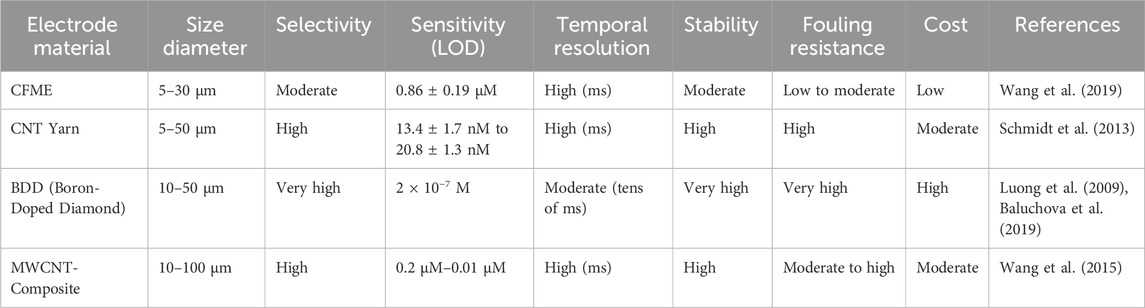 Additionally, hybrid structures incorporating carbon nanotubes (CNTs) and boron-doped diamond (BDD) electrodes have demonstrated enhanced electrocatalytic activity. The synergistic effects of these materials offer increased stability and a broader potential window, which is advantageous for neurochemical analysis. Studies have demonstrated that, nickel-encapsulated CNTs grown on BDD substrates exhibit improved electrochemical performance due to the synergistic effects of the two materials which offers increased sensitivity and a broader linear range for applications such as glucose sensing (Long et al., 2018). These advancements highlight the importance of integrating multi-functional materials to address both electrical and biochemical challenges in neurochemical sensing.