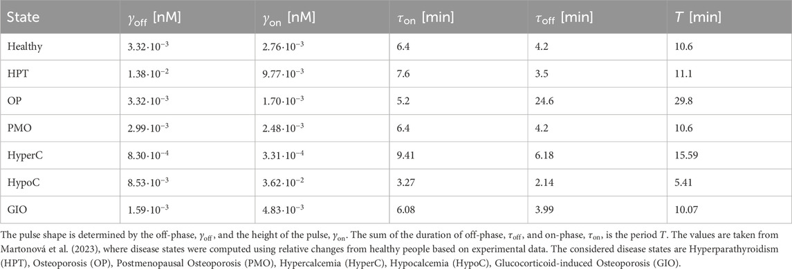 depends on the basal synthesis rate (CPTHbasal), rate of external PTH injection (CPTHinj) and degradation rate (kPTH). Lemaire et al. (2004) assumed that basal PTH concentration remains constant in both healthy and disease states. When PTH levels are elevated—whether due to disease or injected PTH—this is modeled as a sustained, constant increase from the basal level over a predefined time interval, rather than fluctuating daily. Bone diseases related to the parathyroid gland are characterized by alterations of the pulsatile characteristics, e.g., baseline secretion, pulse height, duration of each pulse and time between successive pulses. This work aims to develop the first bone cell population model that incorporates these characteristics.