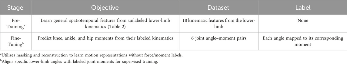 We designed a two-stage approach (Table 1) to train the model: self-supervised SSL pre-training and supervised fine-tuning. This two-stage approach was designed to leverage large-scale unlabeled data effectively while ensuring accurate prediction of joint moments.
