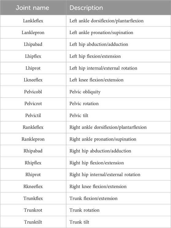 The raw data was processed using a low-pass filter with a cutoff frequency of 15 Hz. The GRF was normalized to body weight (Hof, 1996). All gait cycles were time-normalized from 0% to 100% of the gait cycle using linear interpolation, yielding 897 data samples. 18 kinematic features were extracted (Table 2). The processed data were represented as temporal waveforms on a uniform grid spanning 0%–100% of the gait cycle and extracted for subsequent training and evaluation.