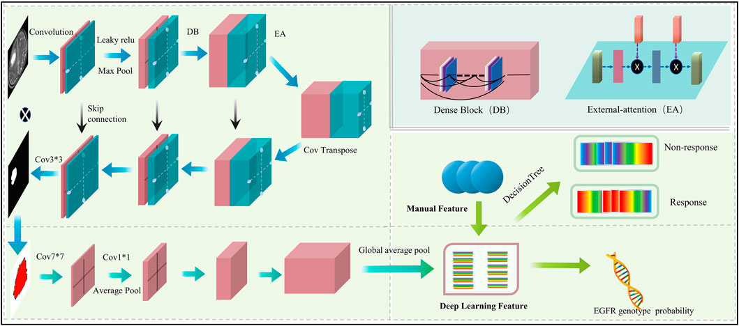 The proposed automated artificial intelligence EGFR-TKI system (ETS) consists of two main components: (i) automatic tumor region segmentation and (ii) EGFR genotype prediction. Specifically, ETS first segments the brain metastasis region using a modified FC-DenseNet with LeakyReLU and external attention (EA), and then predicts EGFR mutation status using a DenseNet-121–based classifier. For patients with EGFR mutation, the system further predicts the response to EGFR-TKI therapy. The architecture of ETS is shown in Figure 2.