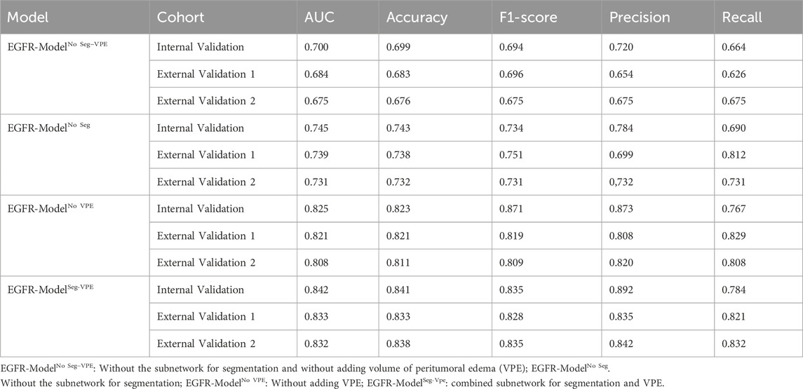 Table 2 compared the performance of the proposed EGFR-ModelNo Seg−VPE, EGFR-ModelNo VPE, EGFR-ModelNo Seg and EGFR-ModelSeg-VPE for predicting the EGFR mutation status. Without the subnetwork for segmentating the BM, the EGFR-ModelNo Seg−VPE yielded lower AUCs, accuracy, F1-score, precision, and recall compared with EGFR-ModelNo VPE in primary and external cohorts. The decreased predictive performance in EGFR-ModelNo Seg−VPE suggested the necessity of the segmentation subnetwork. By integrating VPE, the EGFR-ModelNo Seg showed better performance than EGFR-ModelNo Seg−VPE in terms of AUC, accuracy, F1-score, precision, and recall. This indicated that the VPE can provide additional information to improve the capability of predicting the EGFR mutation status. The EGFR-ModelSeg-VPE, integrating both VPE and segmentation subnetworks, performed the best among all models for predicting the EGFR mutation status. ROC curves of all models on primary and external sets were shown in Figure 4. As shown in Figure 5, the Grad-CAM heatmaps highlight high-response areas within the segmented tumor region, indicating that the prediction of EGFR mutation status is driven by biologically relevant features. These results illustrate a link between the model architecture, particularly the segmentation-guided feature extraction, and the spatial mapping of predictive regions.