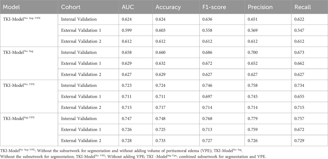 Table 3 compared the performance of the proposed TKI-ModelNo Seg−VPE, TKI-ModelNo VPE, TKI-ModelNo Seg and TKI-ModelSeg-VPE for predicting response to EGFR-TKI. The TKI-ModelNo Seg−VPE without the subnetwork for segmenting the BM genarated lower AUC and ACC compared with TKI-ModelNo VPE that has the segmentation subnetwork. The result indicates the necessity of the segmentation subnetwork. The TKI-ModelNo Seg integrating VPE outperformed the TKI-ModelNo Seg−VPE that is without VPE in terms of AUC and ACC in primary and external cohorts. This suggested that the VPE holds additional information correlated to the efficacy of EGFR-TKI. The TKI-ModelSeg-VPE integrating both VPE and the segmentation subnetwork achieved the best predictive performance with AUCs of 0.747, 0.726, and 0.728 in the internal validation, external validation 1 and external validation 2 cohort, respectively. Figure 6 depicted the ROC curves of the TKI-Model for predicting response to EGFR-TKI.