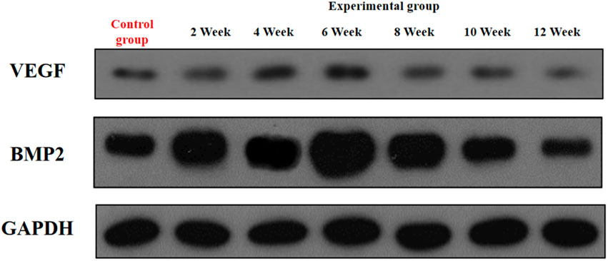 Lysis buffer, BCA protein assay kit, SDS-PAGE gel kit (Henan Cold spring Harbor Biotechnology); primary antibodies for VEGF and BMP-2 (Abcam, United States) and GAPDH (Wuhan Cloud-Clone Corp.); electrophoresis reagents including TEMED, ammonium persulfate (BBI Life Sciences), glycine (AMRESCO).