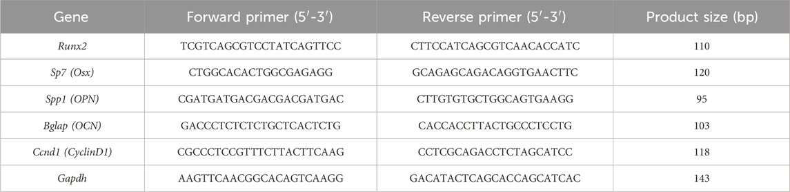 qRT-PCR was used to analyze mRNA expression levels of osteogenesis- and pathway-related genes. BMSCs were seeded at 2 × 105 cells/well in six-well culture plates. After cell attachment, osteogenic induction medium containing different treatments (grouping was performed as described in section 2.3.5) was added. After 7 days of culture, cells from each group were collected, and the total RNA was extracted using TRIzol reagent. RNA concentration and purity were measured using a NanoDrop spectrophotometer (A260/A280 ratio between 1.8 and 2.0). One microgram of total RNA was reverse-transcribed into cDNA using PrimeScript™ RT Master Mix. Diluted cDNA was used as a template for amplification using SYBR® Premix Ex Taq™ II (TaKaRa, Japan) on a real-time fluorescent quantitative PCR instrument (Thermo Fisher Scientific, FHG-PLUS). Target genes included key osteogenic differentiation transcription factors Runx2 (Runt-related transcription factor 2) and Sp7 (Osterix, Osx), late osteogenic marker genes Spp1 (secreted phosphoprotein 1, osteopontin gene, OPN) and Bglap (bone gamma-carboxyglutamate protein, osteocalcin gene, OCN), and cell cycle regulatory gene CyclinD1. Gapdh (glyceraldehyde-3-phosphate dehydrogenase) served as an internal reference gene for normalization. Primer sequences were designed using Primer Premier 5.0 software and are listed in Table 1. All primers were synthesized by Sangon Biotech (Shanghai, China) and validated for specificity and efficiency. Each sample had three technical replicates. The relative expression of target genes was calculated using the 2−ΔΔCt method.