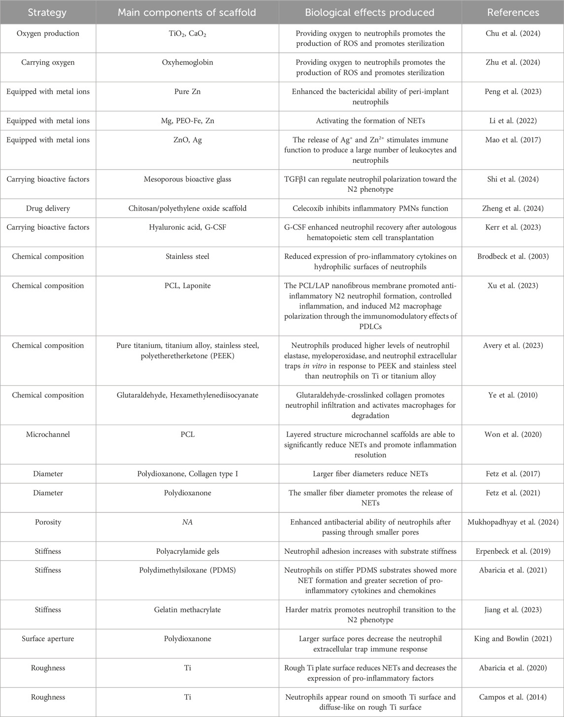 Although bone scaffolds are biocompatible, their implantation induces an in vivo immune response, typically manifesting as an aseptic inflammatory reaction unless subsequently compromised by pathogens (Jhunjhunwala et al., 2015). Neutrophils are pivotal in mediating the aseptic inflammatory response elicited by biomaterials. They act swiftly to establish an acute inflammatory state through mechanisms such as degranulation, chemokine release, and phagocytosis, which are integral to the immediate immune response following biomaterial implantation. Given the pivotal role of neutrophils in aseptic inflammation induced by biomaterials, researchers have initiated investigations into optimizing scaffold design by modulating neutrophil activity. An emerging strategy involves the development of biomaterial scaffolds that can either enhance neutrophil antibacterial functions or regulate immune responses. By employing specific surface modifications, the controlled release of biologically active molecules, or the improvement of morphology and structure, these scaffolds can augment the phagocytic capacity and secretory functions of neutrophils, thereby fostering a more favorable environment for the host to combat infection and promote bone repair at the implantation site (Table 1).