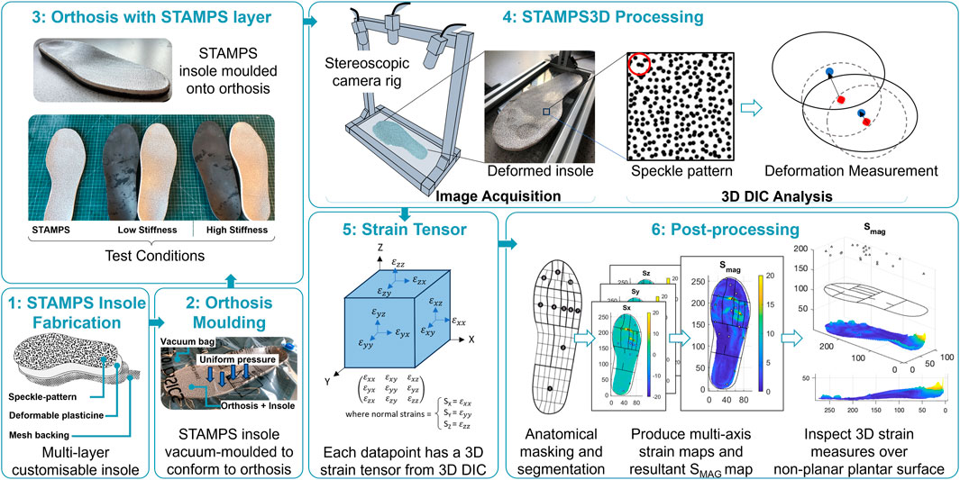 Diagram of a six-step process for analyzing strain in orthosis insoles using STAMPS technology. Step 1 shows STAMPS insole fabrication with multiple layers. Step 2 demonstrates orthosis molding using a vacuum bag. Step 3 describes attaching the STAMPS layer onto orthoses under various stiffness conditions. Step 4 involves image acquisition and 3D DIC analysis with stereoscopic cameras, speckle patterns, and deformation measurement. Step 5 explains the calculation of 3D strain tensors. Step 6 illustrates post-processing with anatomical masking, strain maps, and analysis of 3D strain measures on the plantar surface.