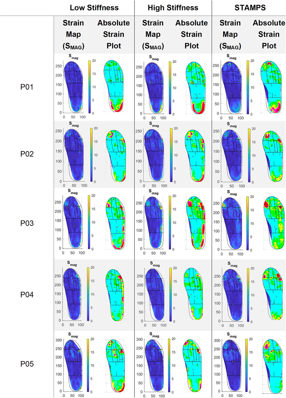 Across all the participants, the global median peak SMAG was 28.34% ranging from 19.97%–52.96%, 42.00% ranging from 21.19%–102.11% and 22.70% ranging from 16.03%–42.21% for the low stiffness, high stiffness and STAMPS conditions respectively. The global median PPP was 412.54 kPa, ranging from 293.00–542.00 kPa. The corresponding SMAG strain maps and absolute plots displaying different coloured strain brackets across the plantar surface are shown in Figure 2. A single strain map representative of all three repeats for each condition and participant is displayed. The strain brackets were selected to better highlight local regions of high strain, e.g., 0%–2.5% (blue), 2.5%–5% (green), 5%–7.5% (yellow), 7.5%–10% (magenta) and >10 (red). The figure shows patterns across the participants, with high strain regions varying across the cohort. For the low stiffness condition, peak SMAG was located at toes 3-5 in one participant, at the 5th MTH in one and at the heel in three. For the high stiffness condition, peak SMAG was located at the 4th MTH in one participant, at the 5th MTH in one and at the heel in three participants. For the flat condition, peak SMAG was located at the hallux in one participant, at toes 3-5 in one, at the 4th MTH in one, at the 5th MTH in one and at the heel in one. PPP was located at the hallux in three participants, at the 2nd MTH in one and at the heel in one. Peak SMAG for all conditions and PPP occurred at the same region in one participant.