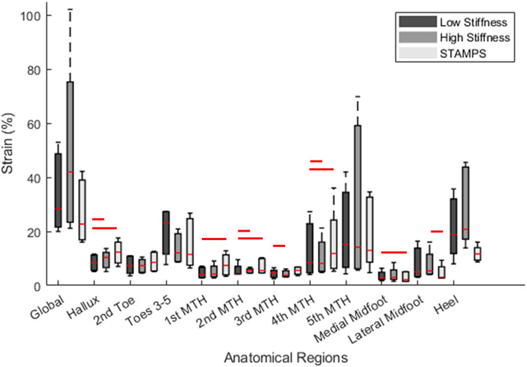 Box plot chart showing strain percentages across various anatomical regions. Categories include low stiffness (dark gray), high stiffness (light gray), and STAMPS (very light gray). Strain varies across anatomical regions and between stiffness conditions. Red lines above box plots indicate significance between conditions based on median measures.