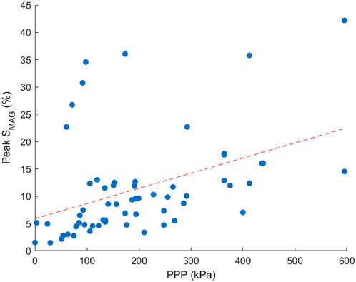 Scatter plot showing the relationship between PPP (kPa) on the x-axis and Peak SMAG (%) on the y-axis. Data points are scattered, with a trend line suggesting a positive correlation.