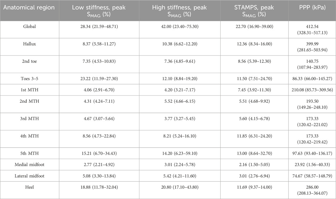 The relationship between PPP and peak SMAG, shown in Figure 4, was found to have significant moderate correlation (rho = 0.52, P < 0.001), aligning with results from a healthy cross-sectional study which also showed moderate correlation (rho = 0.65, P < 0.001) (Jones et al., 2024). Differences in correlation may be due to a smaller sample size in the present study. Although direct measures of in-shoe shear stress are not measured, the STAMPS3D system captures the resultant strain from both shear stress and plantar pressure at the foot’s surface interface. Therefore, the 3D strain data provides a proxy for assessment of plantar load under the tested conditions. Note that the reported correlation is between the peak SMAG measures corresponding to the flat STAMPS3D condition and PPP, since plantar pressure comparison measurements could only be captured under flat conditions due to limitations of the Pedar system. The difference in resolution between STAMPS3D and pressure measurement insoles such as Pedar presents a challenge for regional correlation analysis. STAMPS3D captures strain at higher spatial resolution and across the full plantar surface, while Pedar relies on fewer sensors per region. This may lead to underrepresentation of pressure data in some areas, affecting the strength and reliability of regional correlations. Future studies may benefit from integrating higher-resolution pressure mapping or interpolative techniques to improve regional comparability.