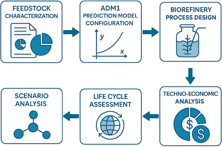 Figure 1 shows the methodology employed in this study. First, we gather feedstock characterization data for prairie biomass and manure. Then, we configure the ADM1 model to estimate biogas and methane production. Next, the ADM1 model is integrated with the biorefinery process design to gather facility material and energy balances. Finally, we conduct techno-economic (TEA) and lifecycle assessment (LCA) to estimate costs and environmental impacts under various co-digestion scenarios.