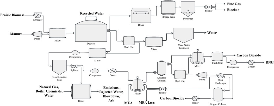 We utilized version 2.37.4 of BioSTEAM in Python 3.11 (Cortes-Peña, 2022) for the system design and implementation of the ADM1. Wild et al. (2024) was used as a basis for biogas upgrading to RNG from the co-digestion of prairie biomass and cattle manure. While Wild et al. (2024) includes a pretreatment for biomass, we chose to simplify the inputs to the ADM1 model to focus on feedstock characterization, without the pretreatment process. The feedstocks are digested with a hydraulic retention time of 30 days under mesophilic conditions. Longer hydraulic retention times would increase biogas yields resulting in lower per-unit costs and environmental impacts. However, increasing the hydraulic retention time has diminishing returns after a certain duration, and capital cost increases can overtake cost reductions. The digestate is thermally treated for eventual soil application. After biogas is collected, hydrogen sulfide is removed from the gas stream. On-site combustion is completed to meet electricity and heat requirements, burning 5% of the biogas stream and purchased natural gas as needed. Carbon dioxide (CO2) is removed from the gas stream by an amine scrubber system with monoethanolamine (MEA). The full process diagram is shown in Figure 3.