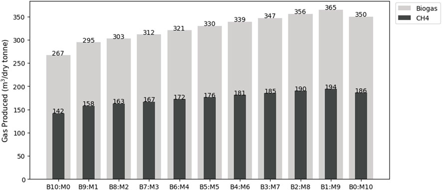 The mono-digestion of prairie biomass produced 156 mL/gVS of CH4 while the mono-digestion of manure produced 219 mL/gVS of CH4. All co-digestion scenarios had larger CH4 production rates than the mono-digestion of prairie biomass. Two out of the nine co-digestion scenarios produced larger CH4 rates than the mono-digestion of manure (B8:M2 and B9:M1), with the highest CH4 production rate at 227 mL/gVS (B9:M1). The production of CH4 and biogas in shown in Figure 4.