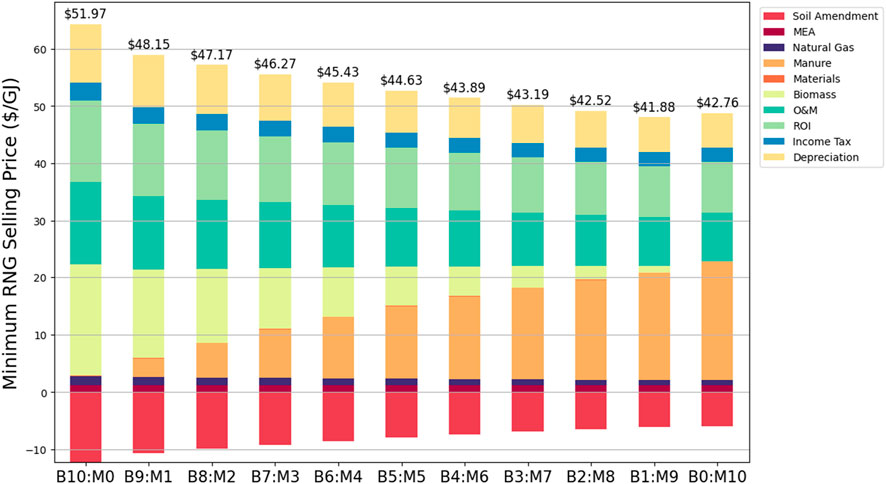 Figure 5. Minimum renewable natural gas (RNG) fuel selling price for prairie grass (B) and manure (M) ratios ranging from B10:M0 to B0:M10.