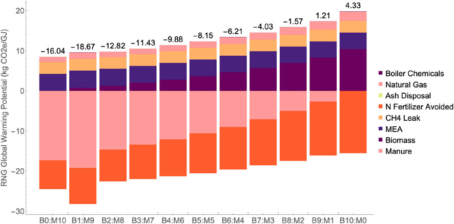 Figure 6. Renewable Natural Gas (RNG) Global Warming Potential (GWP) for prairie grass (B) and manure (M) ratios ranging from B10:M0 to B0:M10.