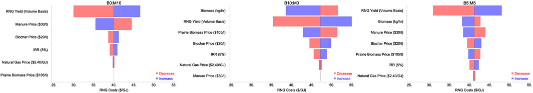 The capital costs of the BioSTEAM process units have been modified following Wild et al. (2024), including cost estimates for the digester system, biomass shredder, and gas compressor. Wild et al. (2024) determined several operating parameters to be sensitive for the estimation of the minimum fuel selling price (MFSP) of RNG. These parameters include the cost of the prairie biomass, cattle manure, biochar, and the internal rate of return (IRR). For further analysis, we are expanding upon those four parameters via an additional literature review. Wild et al. (2024) displays the full sensitivity and uncertainty analyses completed for this system.