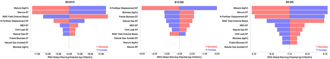 Figure 9 shows the sensitivity analysis results for the RNG GWP. The key parameters for GWP are the manure and biomass factors, the nitrogen fertilizer displacement, and the RNG yield. Twenty percent changes in these parameters vary the GWP by up to 5 kg CO2 eq./GJ There are many reasons why these factors could vary as discussed previously. Therefore, these results highlight the importance of improving our understanding of how these factors vary across different ecological scenarios.