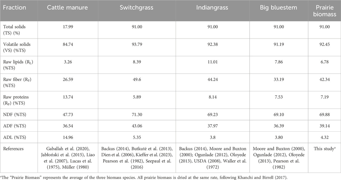 Table 1. Characterization of cattle manure and prairie biomass from literature based on total solids (TS).